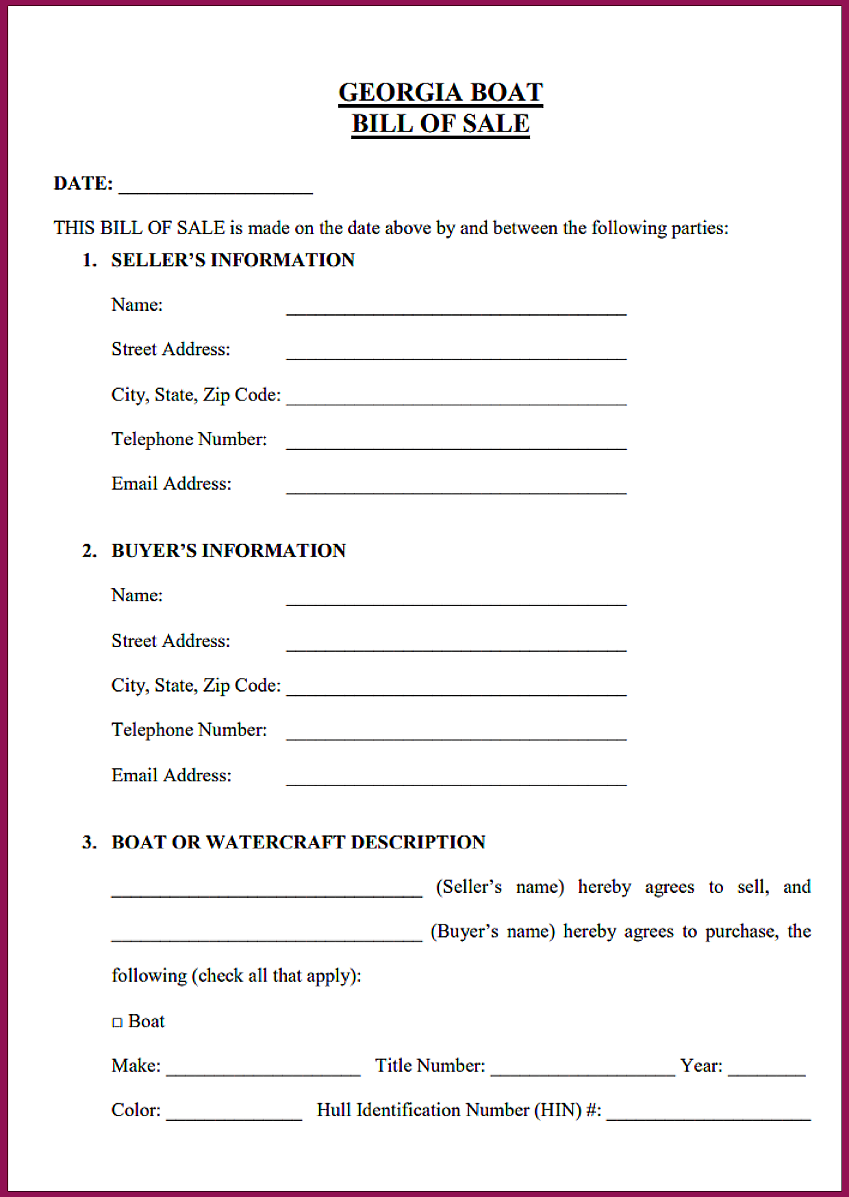 Blank Boat Bill of Sale Georgia