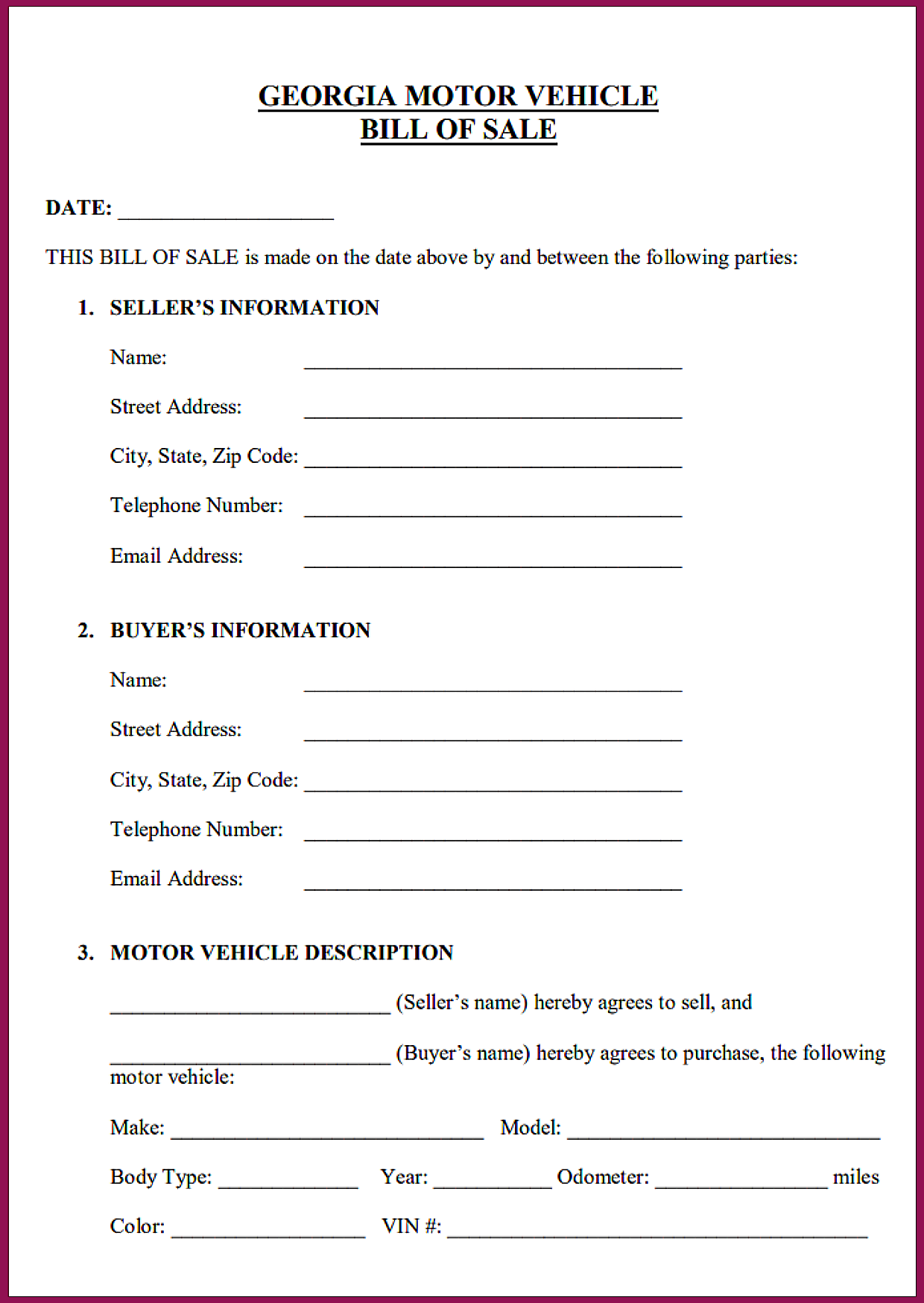 Georgia Motor Vehicle Bill of Sale Form PDF